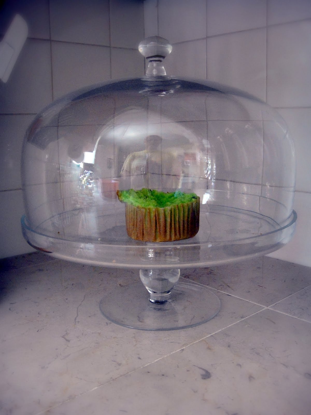 I walk into the kitchen from the 1920's (please oh please Landlord, let me Sweat Equity this for you) to scarf some breakfast before her Pack n Play excitement expires. I remember there is 1 moist pistachio muffin awaiting solo in its glass display like a Tiffany's window design. I walk forward with anticipation to lift the lid, only to discover this: